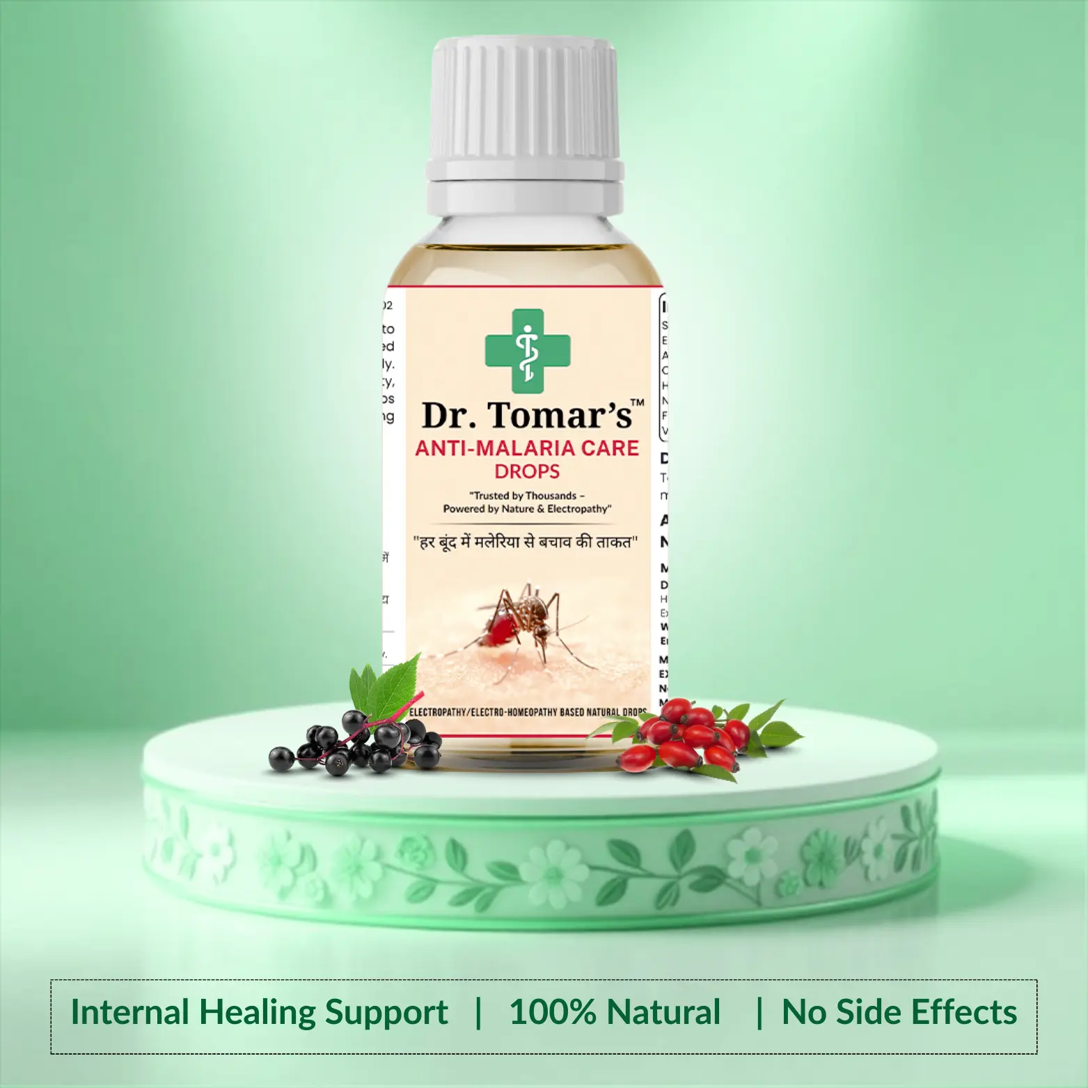 Dr. Tomar’s Anti Malaria Care Drops are a natural electro-homeopathy formulation designed to support fast and safe malaria relief. With immunity-boosting, fever-calming, and blood-strengthening herbal ingredients, these drops work internally to reduce high fever phases, body pain, chills, and weakness — offering dependable fever reduction support and comfort for all age groups. This gentle formulation helps relieve malaria-related exhaustion, sweating episodes, appetite loss, headache, and post-fever fatigue — providing safe malaria relief and effective malaria recovery without chemicals or side effects.